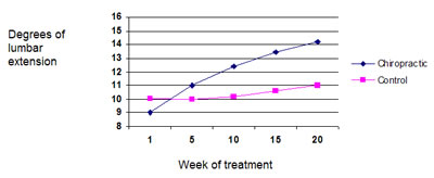 The study found significant improvements in the patients who were given the chiropractic/moist heat treatments, as illustrated by the following graph that shows average extension of the spine measured at each evaluation point: